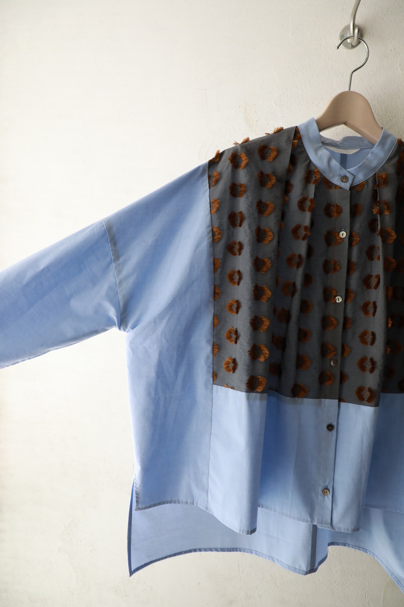 上品さと遊び心を一枚に。軽やかなサックスブルーのシャツ地に、立体感のあるジャカード調の生地を胸元にあしらった異素材コンビシャツです。 シンプルな中にも確かな存在感があり、女性の“さりげなく差がつく”日常スタイルを演出します。